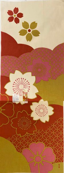 This is a precut long piece of 100% cotton, made in Japan, called a tenugui. Tenugui translates to "hand towel" but is much more than that. It's a piece of cotton fabric, approximately 14" x 36", that can indeed be hemmed and used as a hand towel or tea towel, but also can be quilted, sewn into clothing or other textile goods, or displayed as art. This design is called Sakura Nishiki or "Cherry Blossom Brocade." It's not a brocade fabric, it's a plain-woven cotton; that's just the given name.